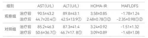 疗程6个月,观察两组治疗前后血清转氨酶(AST、ALT)、稳态模型胰岛素抵抗指数(HOMA-IR)以及NAFLD肝纤维化评分(NAFLDFS)的变化。